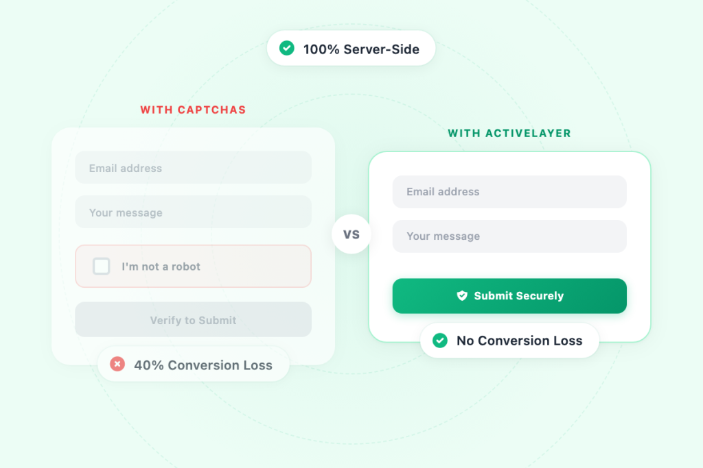 CAPTCHAs cost you up to 40% of form completions. ActiveLayer works entirely server-side. Your visitors never see a puzzle, never solve a challenge, never rage-quit your checkout. They submit forms, post comments, and move on.